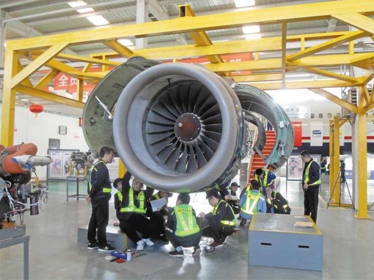 11月14日,在陕西金宇航空科技有限公司,来自河南、吉林等地机场的飞机维修人员正在接受培训,学习空客A320飞机发动机的维修技术。