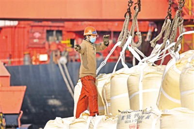 图为2月4日,码头工人在江苏连云港港口装运货物。(摄影/王健民 人民视觉)