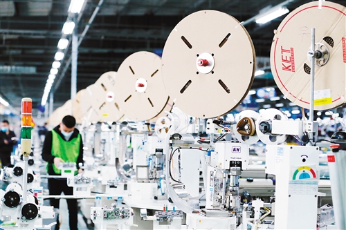 上图3月30日,山东青岛市即墨区的青岛京信电子有限公司,工人在生产出口到韩国的汽车线束产品。(记者林火灿 摄影/梁孝鹏 中经视觉)
